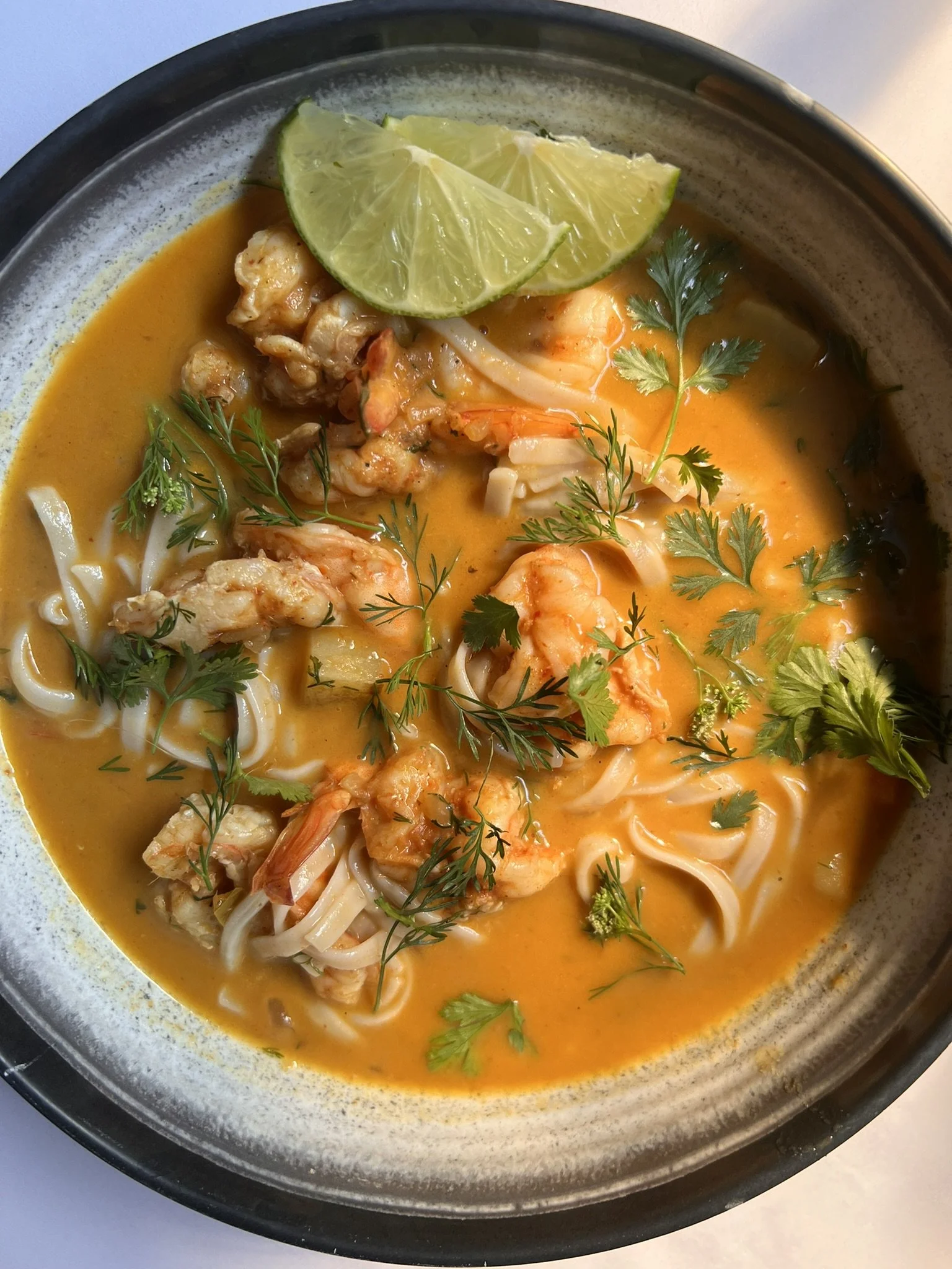 Repartir los fideos en los platos. Servir el curry con camarones por encima. Decorar con cilantro fresco y gajos de lima.